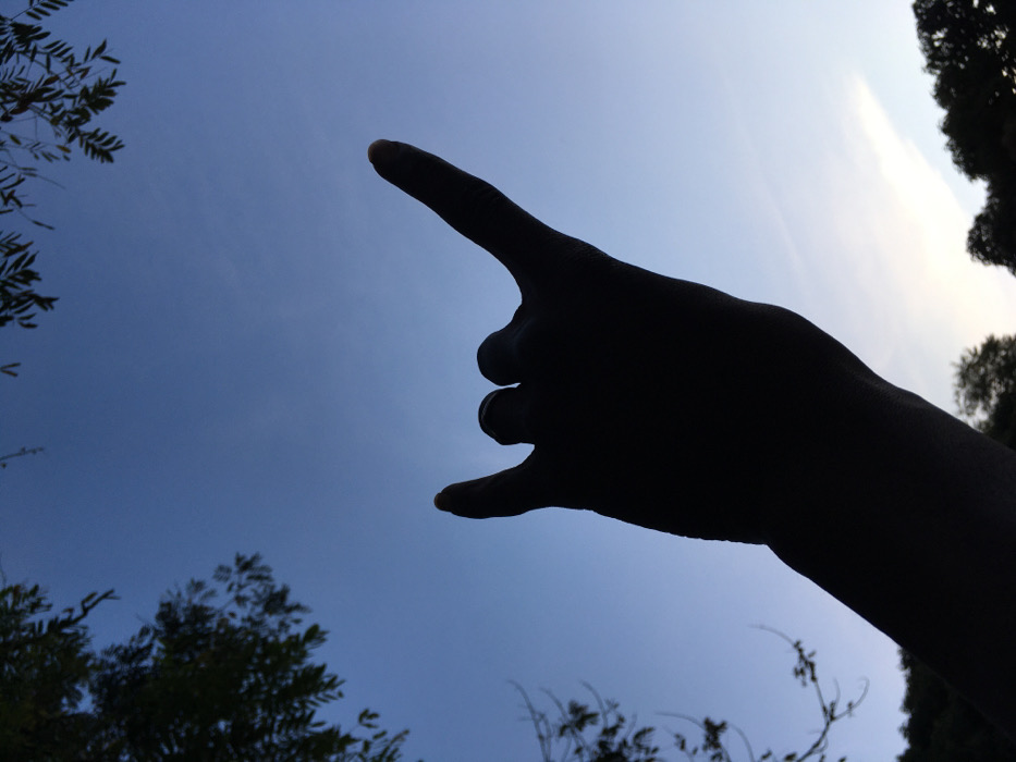A silhouette of a hand in the "rock on" or "devil horns" gesture is centered against a sky with a blue gradient. The hand extends from the lower right, pointing towards the upper left. The backdrop features greenery, with trees framing the left and right edges of the image. The sky transitions from a light blue at the top to a darker blue at the bottom.