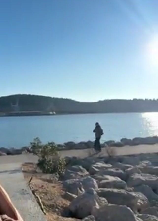 The video begins with a close-up profile shot of a man wearing sunglasses, a pink sweater, and a tan jacket, gazing upwards towards a bright blue sky. The camera then pans to the right, revealing a scenic view of a body of water bordered by land and a rocky shoreline. The sun glares brightly on the water's surface. A figure is walking along a stone pier that extends into the water. The camera continues to pan, showing the length of the pier and the water surrounding it. In the distance, a lighthouse is visible. The sky remains clear and blue throughout the video. The scene suggests a calm, sunny day at a coastal location.