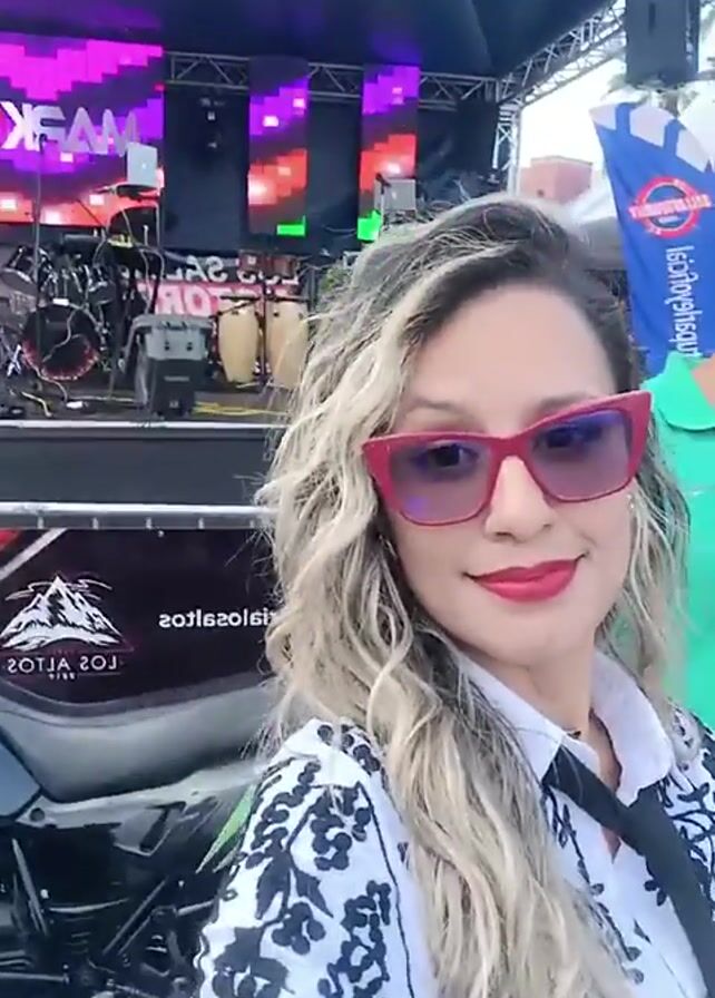A woman in a white blouse with a black floral pattern, red sunglasses, and red lipstick, holds a camera up for a selfie. She has blonde, wavy hair. In the background, a stage is set up with equipment including drums and a large LED screen reading “MARK2”. There’s also a banner that reads “FERIA LOS”. Behind her and to the right, a man wearing a green shirt is partially visible. As the camera moves slightly, other people walk by in the background. In another shot, a large inflatable structure with the word “BERA” on it is visible, with a motorcycle parked beside it. The environment appears to be an outdoor event. There are other tents and people walking around. The day seems bright.