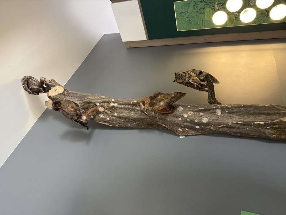 The scene is an indoor exhibit located in Vavřinec, Czechia, featuring a tall, vertical, weathered tree trunk against a blue-grey wall and white ceiling. Four taxidermied owls are displayed at different levels on the trunk. A small, mottled grey-brown owl is perched at the very top. Approximately half a meter below, a medium-sized owl with dark brown and reddish-brown plumage rests on a short, protruding branch. Midway down the trunk, a lighter brown owl with ruffled feathers is affixed to a circular wooden plaque on the side of the trunk. The lowest owl, identified as a Long-eared Owl with prominent ear tufts and distinct yellow eyes, perches on a horizontal branch extending from the trunk towards the right side of the frame. To the right of the tree trunk, a multi-paneled educational display is visible. It consists of a dark green upper section, a lighter green section with line drawings of foliage and text, and a lower section containing several circular, illuminated cutouts showcasing various specimens. Warm artificial light emanates from this display, illuminating the lower right area of the tree trunk. No living individuals or active interactions are present in the static display.