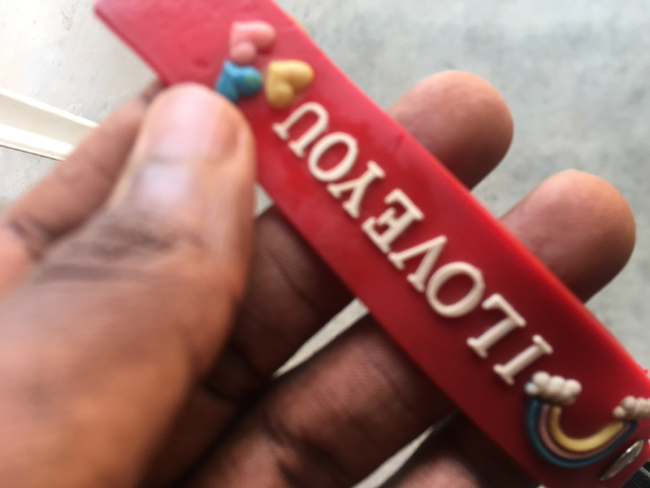 The image displays a close-up, slightly out-of-focus view of an adult hand with brown skin tone. The hand is holding a red, rectangular object horizontally, which appears to be a flexible band. This object features raised white capital letters spelling "I LOVE YOU". To the left of the text, a small, raised multi-colored rainbow design with two white cloud-like ends is present. To the right of the text, three small, raised heart shapes are vertically arranged: a blue heart at the top, a yellow heart in the middle, and a pink heart at the bottom. The fingers of the hand are visible, positioned to grip the object. The background is blurred, showing a light-colored surface, consistent with concrete or tiled flooring, and an indistinct lighter vertical element in the upper right. The scene is situated in Katcha, Nigeria.