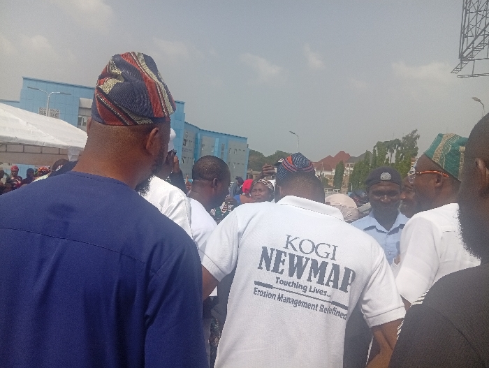 The image captures a daytime outdoor gathering in Okengwe - Obehira, Nigeria, beneath an overcast sky. In the immediate foreground, with his back to the camera, is a male individual wearing a dark blue long-sleeved garment and a patterned cap featuring red, blue, and gold/brown stripes. To his right, another male individual is seen from behind, wearing a white polo shirt with the text "KOGI NEWMAP Touching Lives... Erosion Management Redefined" printed in dark blue. He also wears a multi-colored patterned cap. Further right in the mid-ground, a man in a light blue collared shirt and a dark cap is visible, facing towards the right with a slight smile. Beside him, another man in white clothing wears a green and white patterned cap. A crowd of individuals, including both men and women, is partially visible throughout the mid-ground and background, suggesting an event or public assembly. In the background on the left, a white canopy tent is present. Behind the crowd, several light blue multi-story buildings with numerous windows are visible. A tall metal framework, consistent with a billboard structure, stands against the sky on the far right. Utility poles and some sparse vegetation are also discernible.