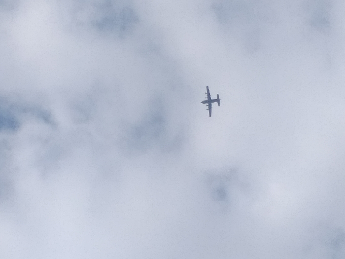 An airplane flies in a cloudy sky. The aircraft is silhouetted against the gray and white clouds, viewed from below, showing the plane's underside. Its wings are extended, and it appears to be a four-engine turboprop, possibly a military transport. The clouds fill the majority of the frame, offering a stark contrast against the dark silhouette of the airplane.