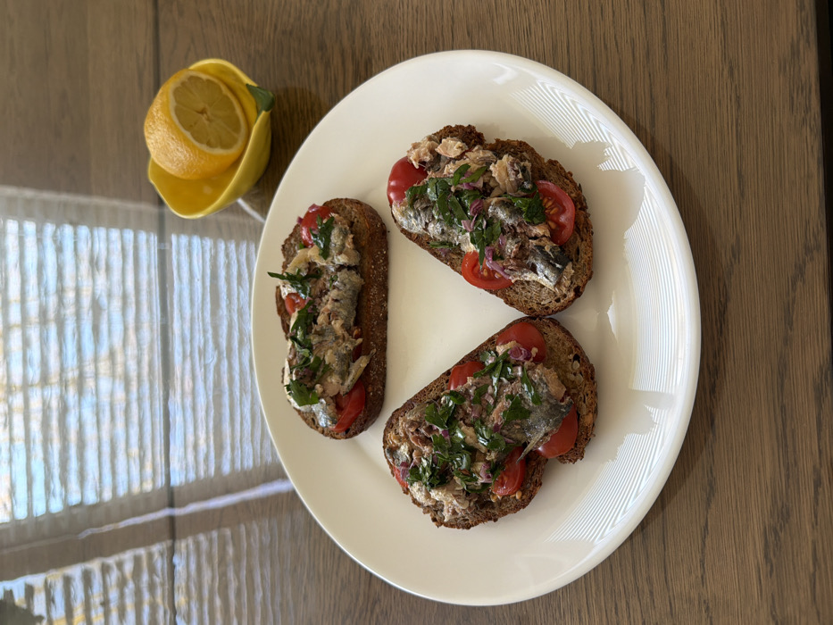 The scene is set indoors on a reflective light brown wooden table in Helmond, Netherlands. A white, round plate centrally displays three open-faced sandwiches. Each sandwich consists of a dark whole-grain bread slice, topped with halved red cherry tomatoes, a mixture of flaked tinned fish (resembling sardines or small mackerel, possibly with tuna), chopped green herbs (likely parsley or cilantro), and finely diced red onion. To the upper right of the plate, a halved yellow lemon rests within a small, yellow, lemon-shaped ceramic dish. The background and upper table surface show reflections of horizontal window blinds, indicating natural light entering the space. No individuals are visible.