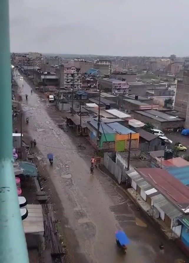 n aerial view of a densely populated urban area, likely a neighborhood or town, on a rainy day. The camera pans across a landscape filled with buildings of varying heights and structures, mostly single-story shacks and multi-story residential buildings. The roofs of many of the structures are made of corrugated metal, some painted in different colors. A wet dirt road runs through the center of the view, with a few cars and motorcycles visible on the road. Several people, mostly on foot, can be seen navigating the street. The sky is overcast and gray, indicating the ongoing rain. The overall impression is that of a lower-income, densely inhabited urban environment impacted by wet weather. The video is slightly shaky and out of focus.