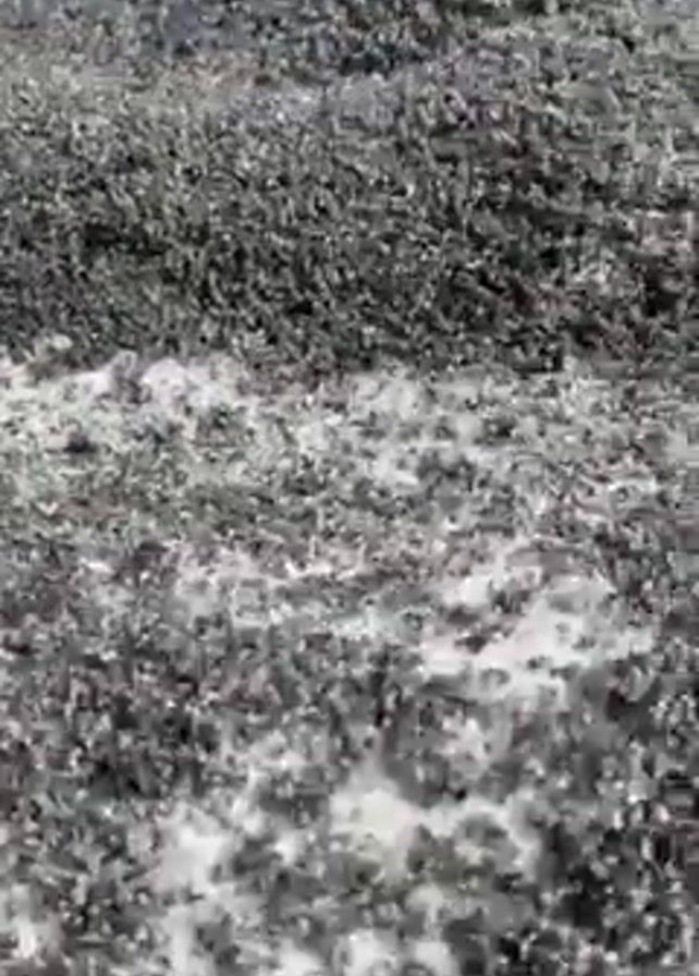 person pouring a dark, viscous liquid from a clear plastic bottle onto a mixture of gray and white particles on a surface. The gray particles appear to be small and granular, while the white ones are larger and more crystalline. The liquid is poured in a concentrated stream, creating a small pool on the surface. The surroundings appear to be outdoors.