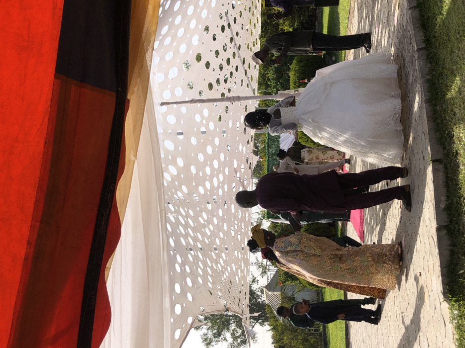 An outdoor event is depicted in Bukuru, Nigeria, under a multi-layered fabric canopy