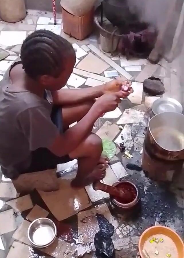 A person with braided hair sits on a makeshift seat of cardboard on a tiled floor, cutting meat with a knife. The person is barefoot and wears a grey shirt and dark shorts. Around them are various cooking items: a pot on a stove with steam rising, a mortar with a reddish substance, and bowls containing ingredients. The floor is visibly stained and cluttered with debris. In the background, there are buckets and other kitchen items stacked against the wall.