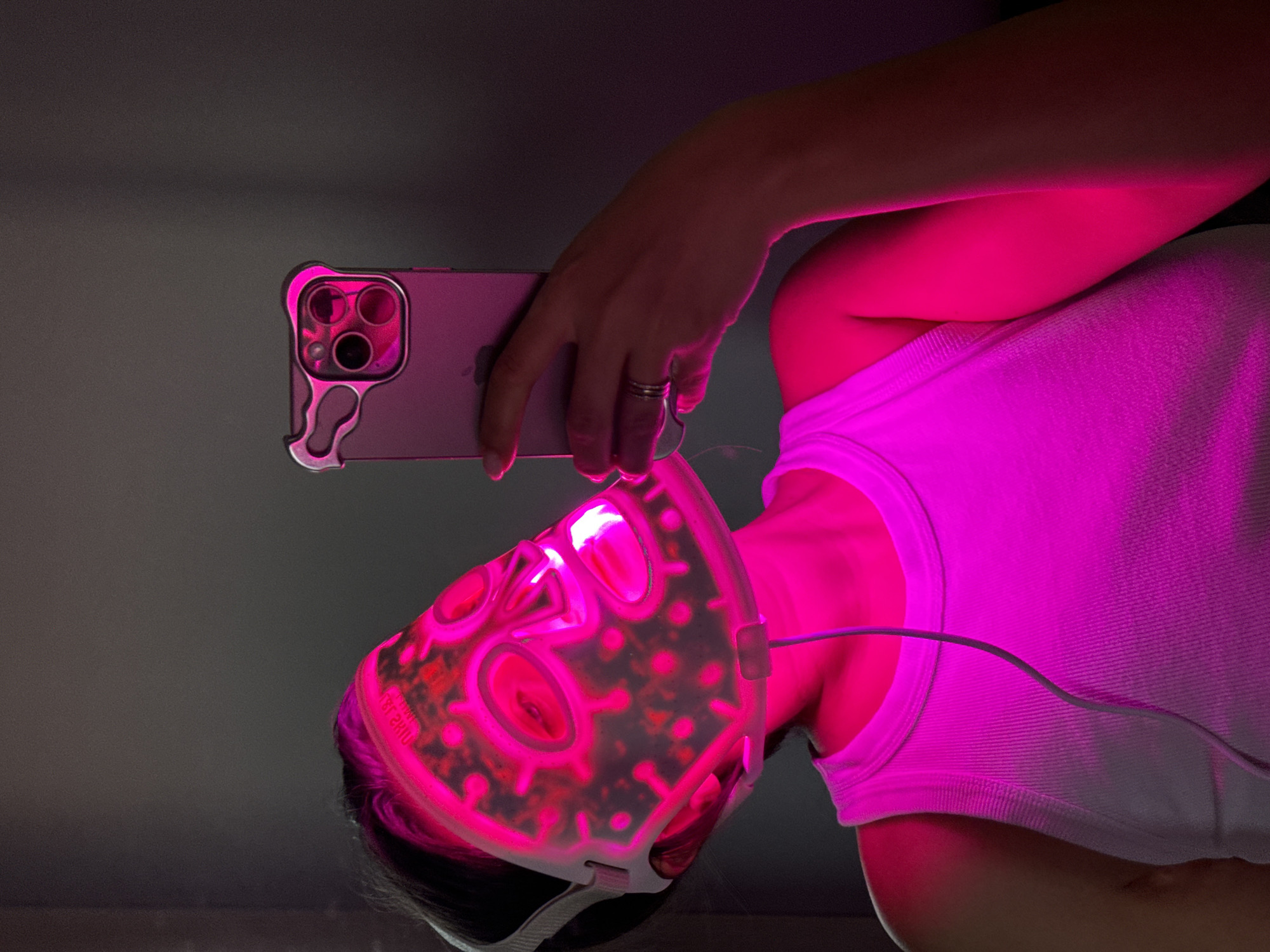 An individual is depicted indoors in Vnukovo, Russia, captured from the upper torso upwards. The person, with dark hair, is wearing a white ribbed tank top and is actively taking a photograph or video using a smartphone. The smartphone, an iPhone model with a triple camera array and a distinctive clear or translucent protective case featuring a carabiner-style attachment point, is held vertically in the subject's right hand, angled towards their face. A ring, appearing as two thin bands, is visible on the ring finger of the right hand. The subject's face is obscured by a translucent white LED light therapy mask, which is actively emitting a strong magenta-pink light. This light illuminates the mask's internal structure and circuitry, casting a prominent pink glow over the subject's skin, clothing, and the smartphone. A white power cable extends from the lower right side of the mask, running down the front of the subject's chest. The immediate background is a dark, featureless surface, indicating an indoor setting with the primary illumination originating from the LED mask.