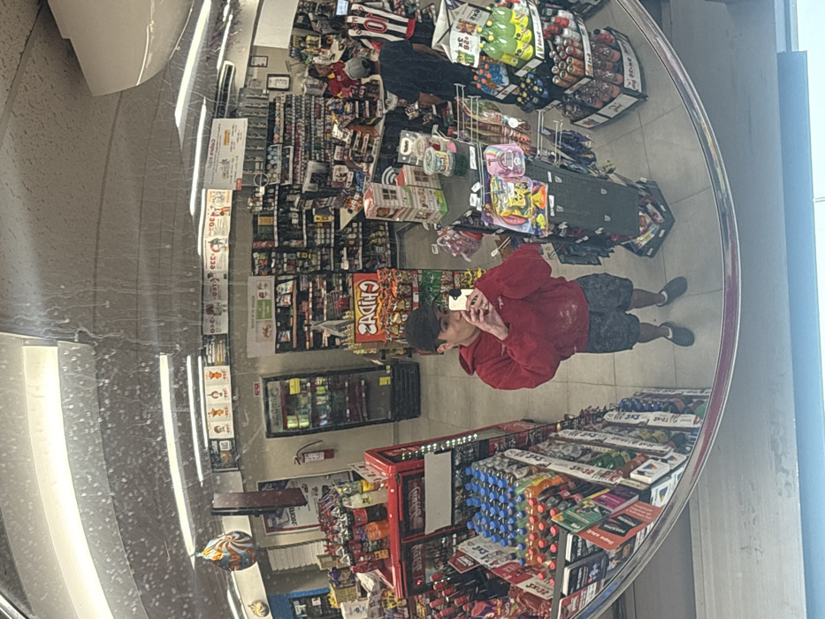 A fisheye lens captures the interior of a convenience store. Shelves stocked with goods line the walls, and refrigerated cases stand nearby. A person in a red hoodie and shorts holds a phone, possibly taking a picture of themselves or the store. Another person in dark clothing is visible near the back, seemingly browsing. The lighting is bright, typical of a retail environment.