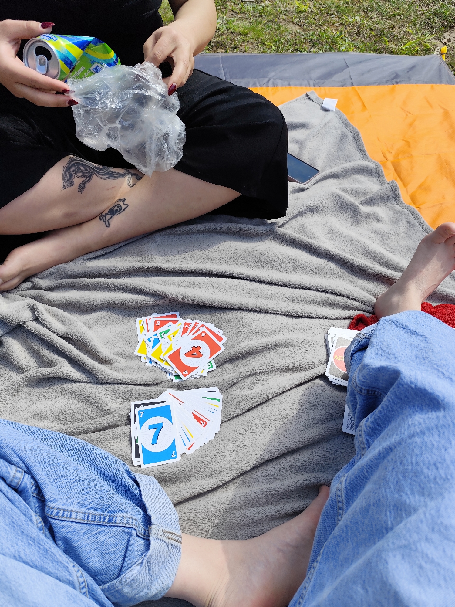 Two people are sitting on a grey blanket laid out on an orange and grey tarp in an outdoor setting. One person is wearing black clothing and has a can and plastic bag in their hands, with visible tattoos on their leg. The other person is wearing light blue jeans. There are scattered Uno playing cards on the blanket between them. One person is holding a Blue 7 card. The scene appears to be taking place on a grassy area, as a hint it could be Vratsa, Bulgaria.