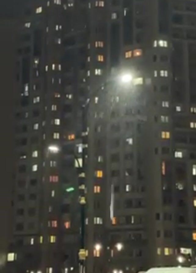 nighttime urban scene. A tall apartment building is visible with numerous illuminated windows. In the foreground, there is a street lamp that is lit. It is snowing, and the snowflakes are illuminated by the streetlight. There are also cars parked along the street. A person in a pink hooded sweatshirt is crouched near a street lamp, partially visible.