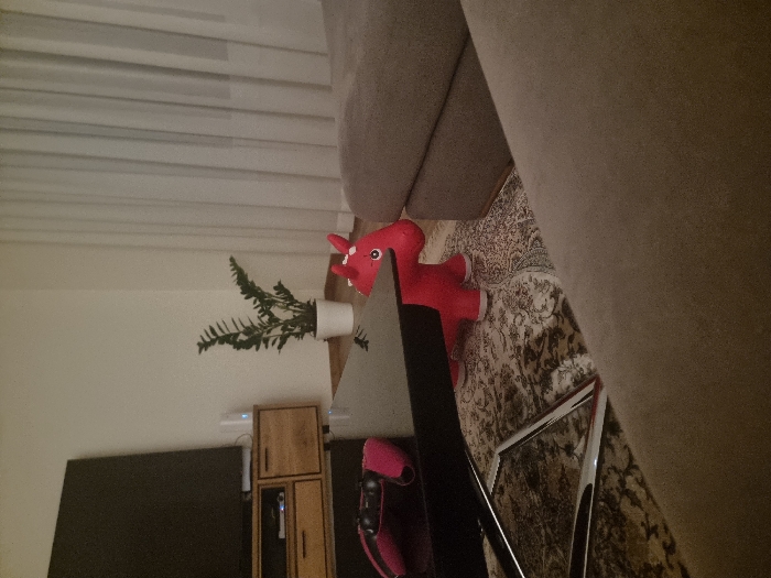 A partial view of a living room features a neutral-toned sofa dominating the upper right. A red plush dinosaur toy rests on a patterned rug, near a white table partially obscured by a black object. A fern in a white pot sits atop a wooden cabinet with a television beside it. Light streams in through white curtains.