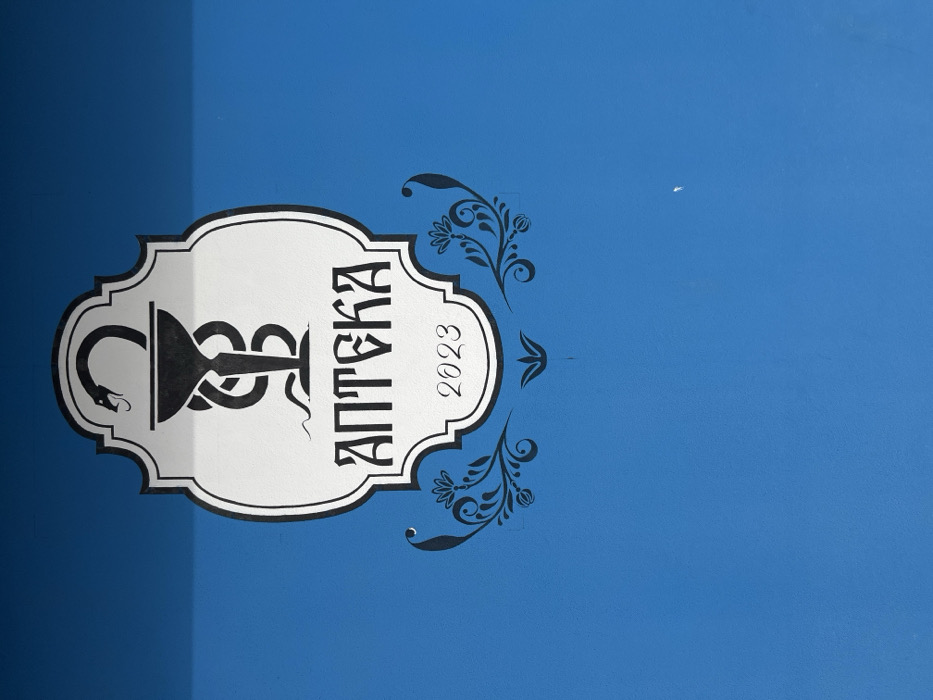 A white, ornate sign with a black border is centrally displayed on a vibrant blue vertical surface, indicative of a building wall in Koprivshtitsa, Bulgaria. The sign features the Rod of Asclepius symbol in black, depicting a serpent entwined around a chalice. Below this emblem, the Cyrillic word "АПТЕКА" (PHARMACY) is inscribed in a decorative black font. Directly beneath the text, the year "2023" is printed in black numerals. Black ornamental scrollwork extends horizontally below the main sign. The background is a solid, uniform blue, devoid of other objects, people, or interactions. The image focuses exclusively on this architectural detail, likely marking the entrance or facade of a pharmacy.