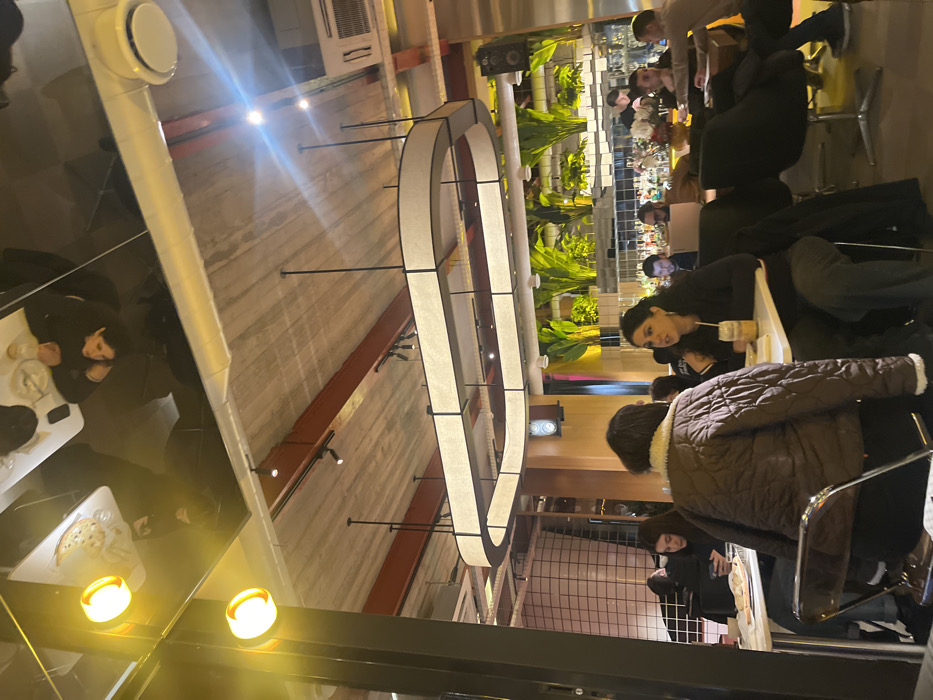 This image depicts the interior of a modern restaurant or bar, identified as "The Kond" in Yerevan, Armenia. The scene is observed from a seated perspective, focusing on patrons dining and socializing. In the foreground, two women are seated at a white rectangular table. One woman, with dark hair, is seen from behind, wearing a brown quilted jacket with a light fleece collar. Facing her, another woman with dark hair and wearing a dark top is actively speaking, looking towards her companion. A clear plastic cup with an orange beverage and straw, along with a white plate containing food, rests on the table in front of her. To the left, a third female patron with dark hair is visible, looking at a mobile phone. The background features a bustling bar area. A long bar displays various bottles and glassware, with a male bartender preparing drinks behind it. Above the bar, a tiered arrangement of vibrant green plants provides a natural, illuminated backdrop, situated below a patterned wall section. Several male patrons are seated at the bar on dark stools; one bearded man with glasses is visible looking at a silver laptop, while others are engaged in conversation. The interior design incorporates industrial elements. A dark, highly reflective ceiling surface mirrors the lights, tables, and patrons below, including an inverted reflection of a male face and two prominent yellow-lit wall sconces. Above this reflective surface, a raw concrete ceiling features exposed reddish-brown I-beams, white ventilation ducts, and black track lighting. A large, distinctive oval/racetrack-shaped light fixture with a white diffused illumination hangs centrally from the industrial ceiling by thin dark rods. A white grid-patterned wall is visible on the far left.