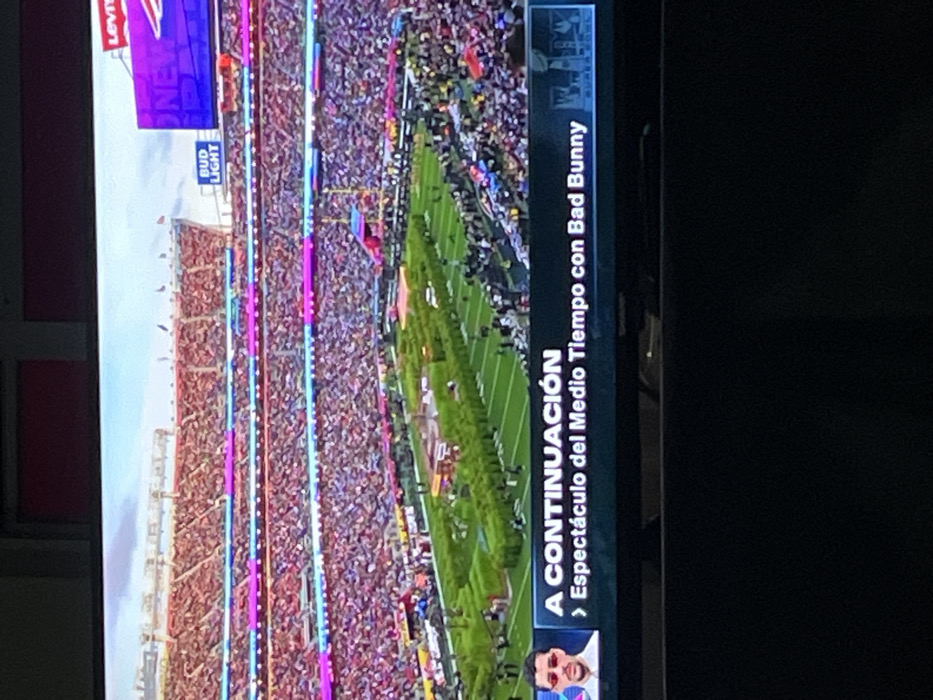 The image captures a stadium packed with spectators, likely at a sporting event like the Super Bowl. There's a football field in the center, and the crowd fills the stands. Signage, including "BUD LIGHT" and "LEVIS," is visible. A banner reads "ONEW." A lower-third graphic in Spanish announces "A CONTINUACIÓN > Espectáculo del Medio Tiempo con Bad Bunny," indicating that Bad Bunny is the halftime show performer. A blurred figure wearing sunglasses is in the graphic.