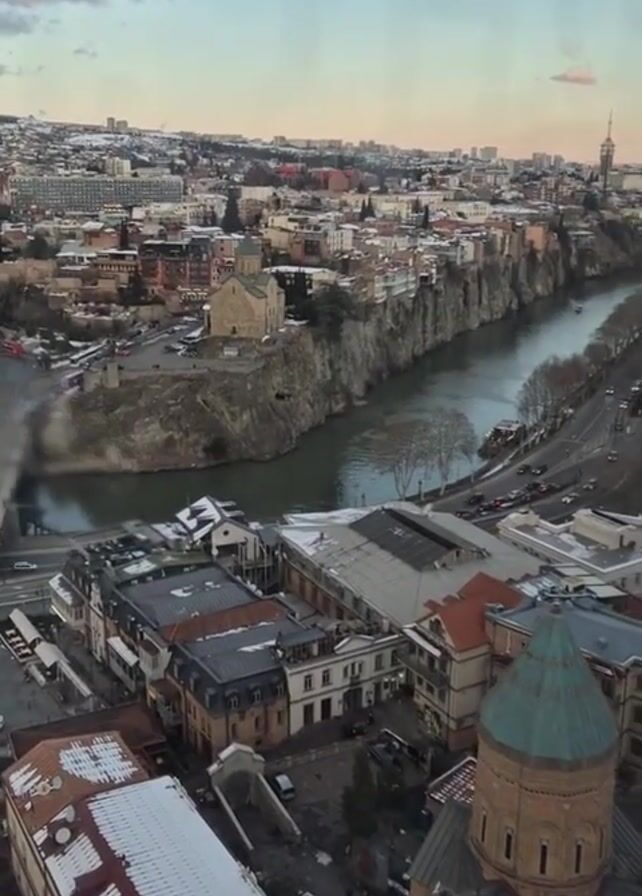 The video displays a wide-angle view of a city, likely Tbilisi, Georgia, observed from a high vantage point