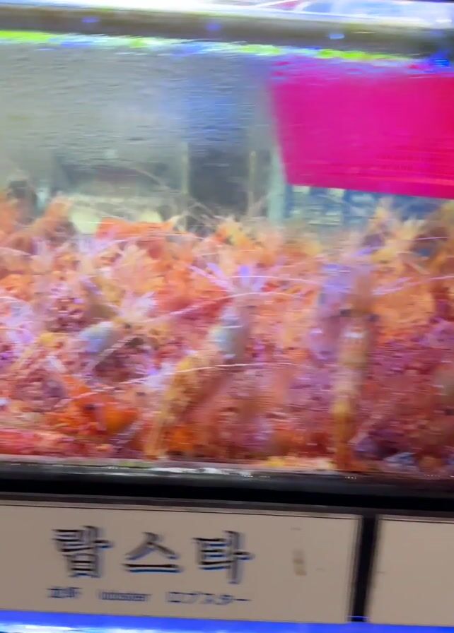 The camera pans over a glass tank filled with a large number of Dokdo shrimp, also known as “Dokdo flower shrimp