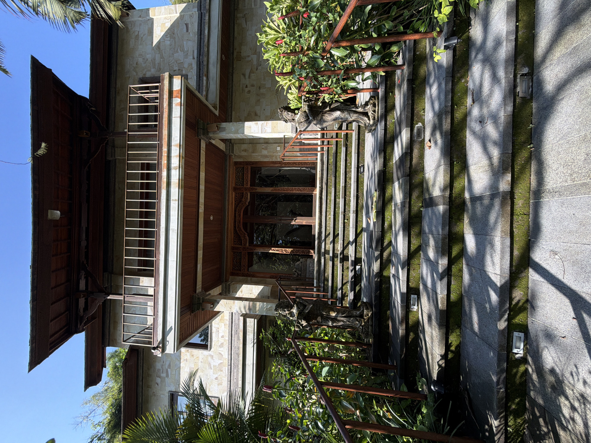 The image depicts an exterior view of a building located in Kedewatan, Indonesia. The architecture features a traditional Balinese style with a multi-tiered roof made of dark wood, a stone facade, and wooden accents. A set of stone stairs leads up to a wooden-framed doorway with decorative carvings. Railings of rusted metal flank the steps, surrounded by lush greenery. Moss grows in the crevices between the stone steps. Sunlight casts shadows across the scene.