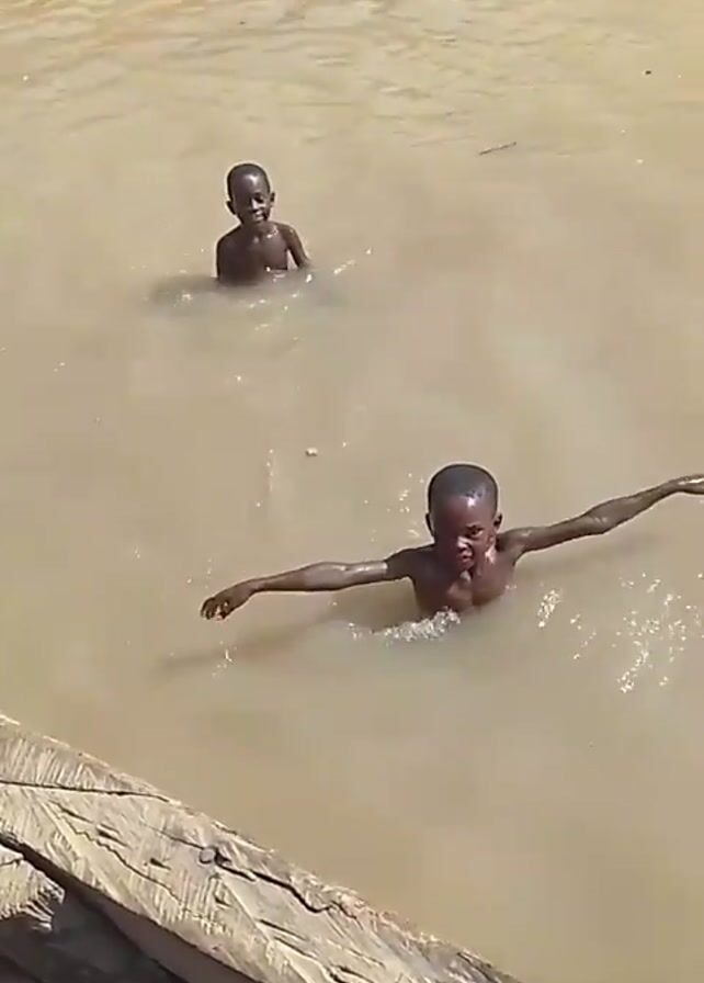 two young children, possibly boys, swimming in a murky, brown-colored body of water