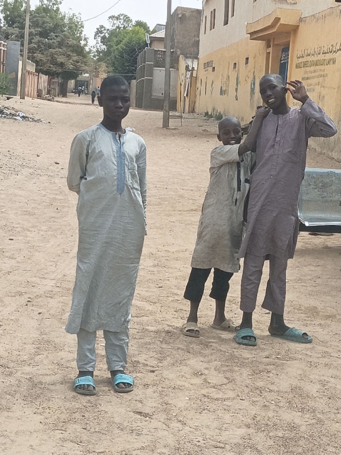 A daylight scene in Hotoro South, Nigeria, depicts three males standing on an unpaved, sandy road