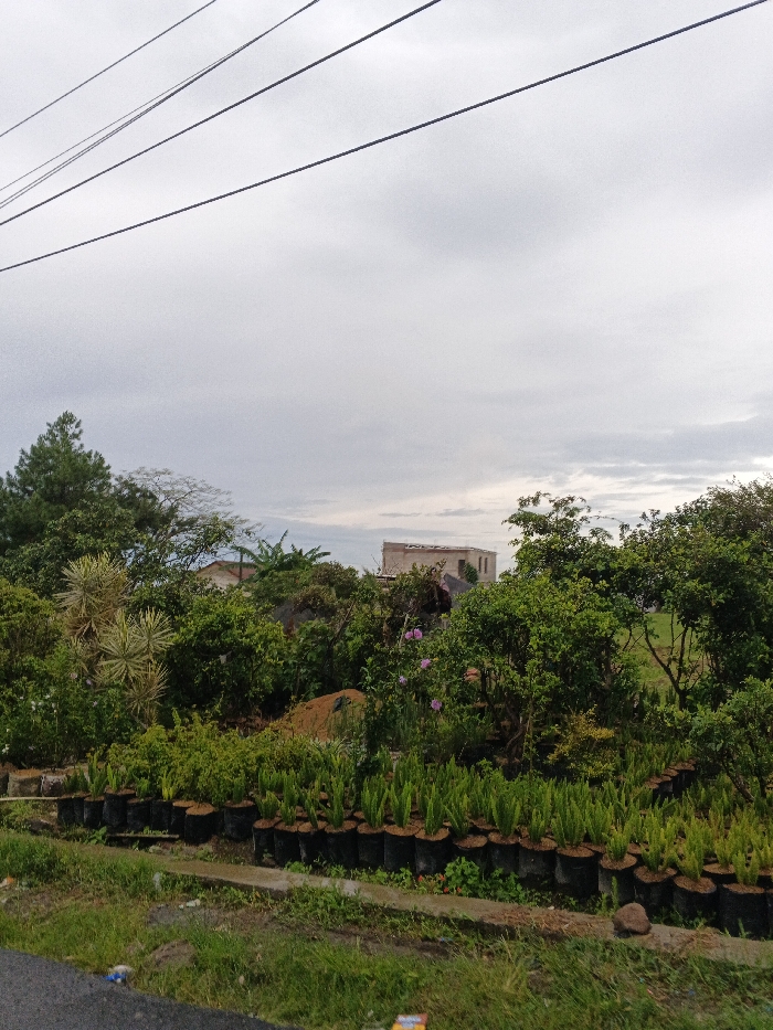 The image presents an outdoor scene in Khan Boeng Keng Kang, Cambodia, under an overcast sky. In the foreground, a dark asphalt road transitions into a strip of green grass, bordered by a concrete curb. Along this curb, a linear arrangement of numerous small green plants in black plastic grow bags occupies the lower mid-ground. Immediately behind these potted plants, a dense assortment of varied green foliage, including bushes, trees, and spiky-leaved plants, fills the mid-ground. A mound of reddish-brown soil and several pink flowers are visible within this greenery. In the background, several buildings are partially visible through the foliage, notably a light-colored structure with an irregular roof and visible window openings, possibly under construction. The upper portion of the frame features a light gray, cloudy sky bisected by four dark, parallel overhead power lines. No individuals or active interactions are depicted.