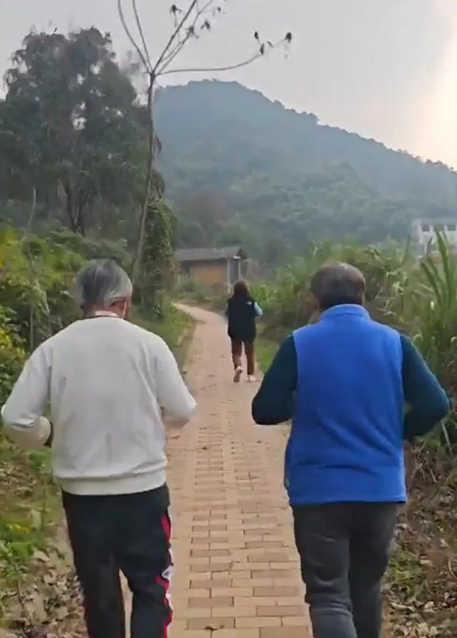 Three people are running along a brick path. The camera follows them from behind. The first person is wearing a white sweatshirt and black sweatpants. The second person is wearing a blue vest and black pants. The third person, ahead of them, is wearing a dark jacket and brown pants. The path is surrounded by greenery, including tall grass and trees. A small building is visible in the distance, along with a green mountain. The sky is overcast.