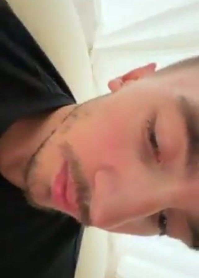 A man wearing a black t-shirt looks into the camera. He is lying down, possibly on a couch or bed, against a white or light-colored cushion. He has short hair, light skin, and a light beard. He smiles and closes his eyes briefly. The background consists of a white or light-colored curtain or wall.