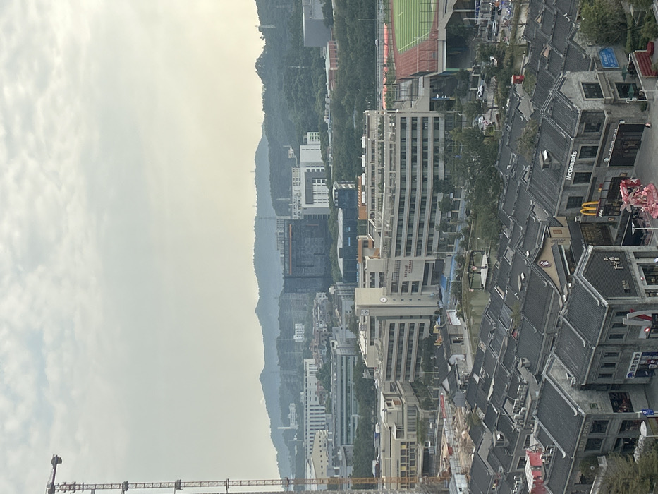 This image presents an elevated view of an urban landscape in Huangpu District, China, under an overcast sky