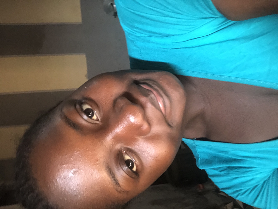 The image depicts a close-up, slightly upward-angled selfie of a young adult female with dark skin, located in Kujama, Nigeria