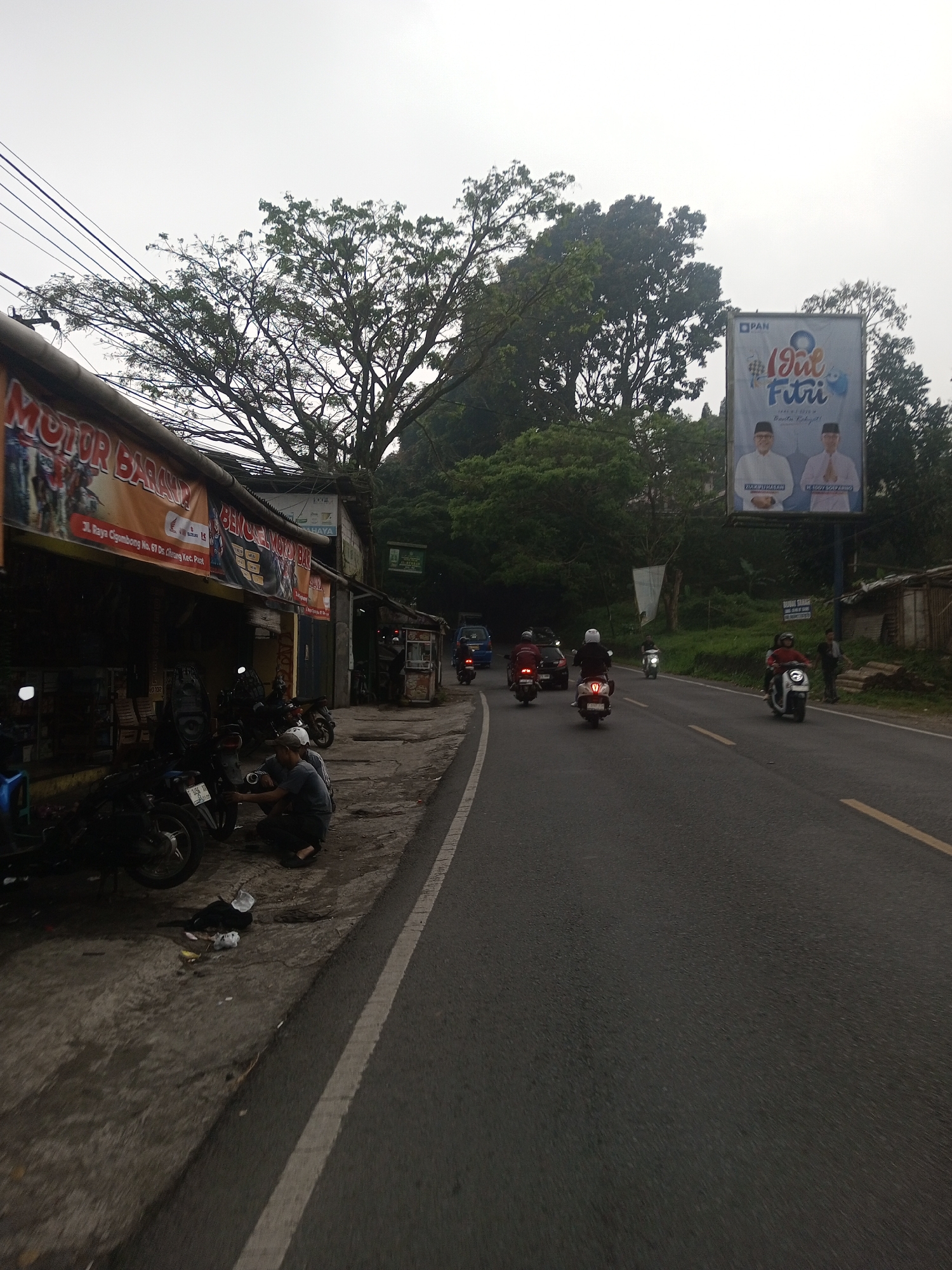 The scene depicts a roadside area in the city of Kan Beit, Myanmar, under an overcast sky with diffuse daylight. A two-lane asphalt road occupies the foreground, featuring a solid white line on the left shoulder and a broken yellow line on the far side. To the immediate left, a row of single-story commercial buildings with corrugated metal roofs runs parallel to the road. The prominent structure displays a red and white banner advertising 'MOTOR BARU' and 'BENGKEL MOTOR BAL,' including Honda and Suzuki logos and an address referencing 'Jl. Raya Cigombong No. 67 Ds Cilang Kec. Pit.' Multiple motorcycles and scooters are parked on the concrete pavement in front of the shops. One individual, dressed in a grey t-shirt and dark pants, is crouched, attending to the rear wheel of a parked motorcycle. Another person in a white helmet sits on a scooter nearby. Various pieces of refuse are scattered on the pavement. Utility poles and overhead wires are visible above the buildings on the left. On the right side of the road, dense green foliage and tall trees form a background. A large billboard displays an 'Idul Fitri' message with a 'PAN' logo and images of two men in white and light-colored attire. Several motorcycles and scooters with riders, some carrying passengers and wearing helmets, are traveling on the road away from the viewer. A dark blue van is also present further down the road. Another person stands on the right shoulder further in the distance.