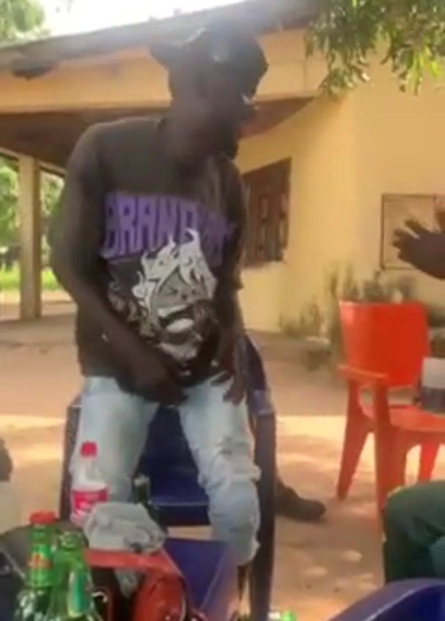 man dancing on a chair outdoors. The man has dark skin and wears a dark t-shirt with an anime-style graphic, ripped light-blue jeans, and a baseball cap. He is gesturing and appears to be lip-syncing. A blue plastic table stands in front of him. On the table are bottles of beer and a bottle of soda. Other people are seated around the table, but only parts of them are visible. The setting appears to be a casual outdoor gathering, possibly near a building with a beige exterior. Trees and a cloudy sky are visible in the background.