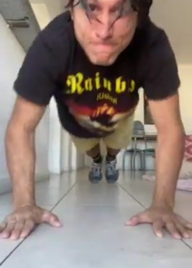 A man in a black t-shirt with the word “Rainbow” on it is doing push ups on a white-tiled floor. His feet are clad in sneakers and visible towards the back. Behind him is a hallway, with a table and chairs slightly visible. He looks into the camera. His hair is dark, shoulder-length, and disheveled.