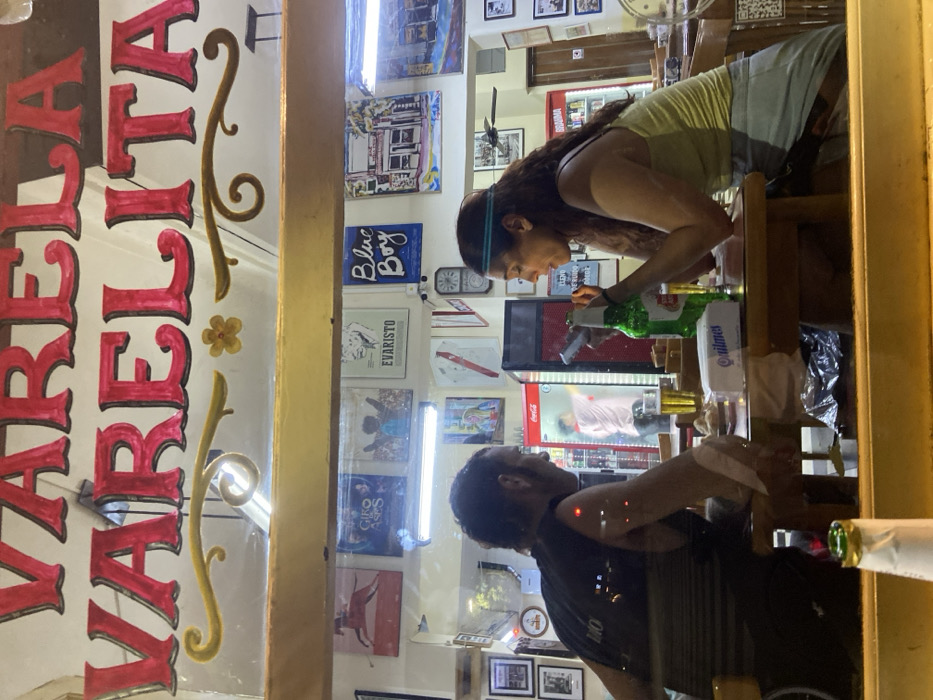 A woman in a yellow top pours beer from a green bottle at a bar, with a man in a black tank top reflected in the glass. "Varella Bella" is written in red on the window. Various pictures and posters adorn the wall behind the bar, along with a refrigerator stocked with beverages. A clock and other decorative items are visible. The bar area appears to be well-lit.