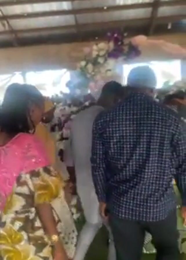 wedding reception area with people dancing near a floral archway. The camera pans to the side, showing a woman walking and carrying a plastic bag. The area has green turf on the floor and appears to be in a tented structure. Decorations are visible in the background.