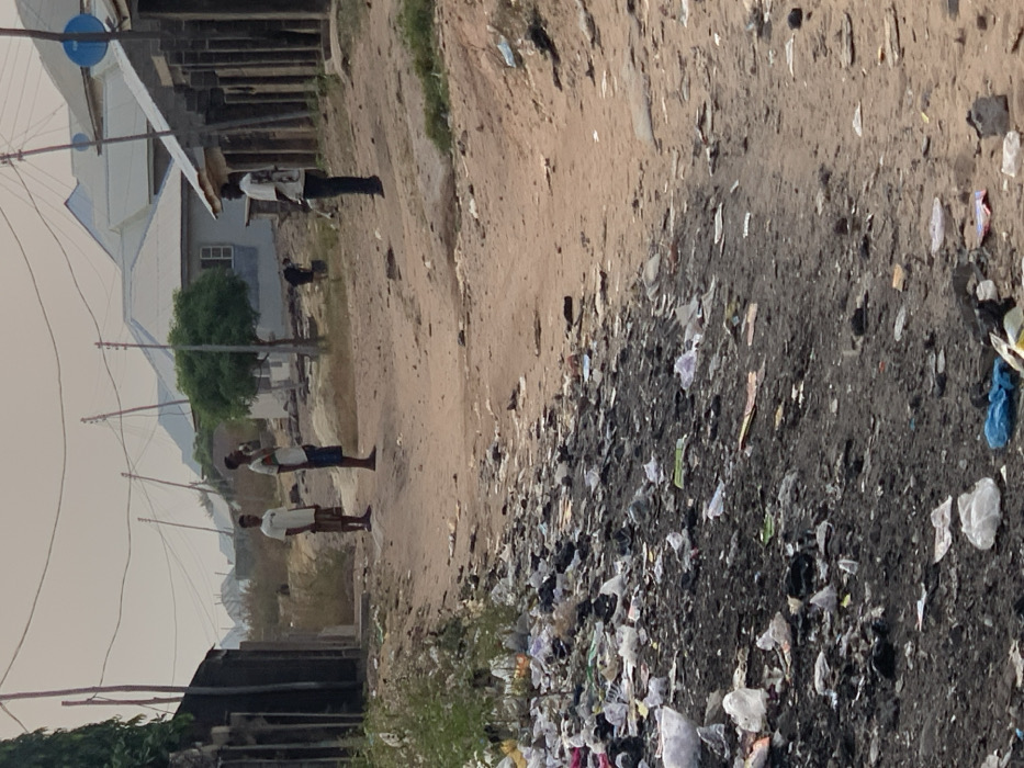 - "An outdoor scene shows a dirt road strewn with litter, contrasting with a clearer path along which stand three individuals in white shirts and dark shorts" by FM-JIEGo1, licensed under CC BY 4.0