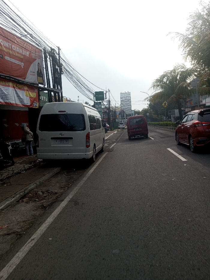 The image depicts a daytime street scene along an asphalt road in a commercial area. A large red banner on the left side identifies the location as "POINT CIANJUR." The license plate on the white van, "D 7303 NR," is consistent with registrations from Bandung, Indonesia, which is geographically distinct from San Pya, Myanmar. In the foreground on the left, a white Toyota Hiace van is parked on a dirt verge adjacent to a concrete sidewalk. A single individual, wearing light-colored clothing and a head covering, is partially visible near the front passenger side of the parked van, appearing to stand or bend down. Above, a dense cluster of black utility wires crisscrosses overhead. Buildings line the left side of the street, featuring additional red and white banners below the main "POINT CIANJUR" sign. Further down, a green sign with "PIXEL" is visible, followed by a tall, silver-colored billboard structure. The asphalt road extends into the distance with visible white lane markings. A red minivan is traveling away from the viewer in the left lane, and a red SUV is similarly moving forward in the right lane. On the right side of the road, a median or shoulder is lined with green foliage, including palm trees, and a yellow diamond-shaped road sign with a curving arrow is visible among the trees. The sky is bright and appears overcast.