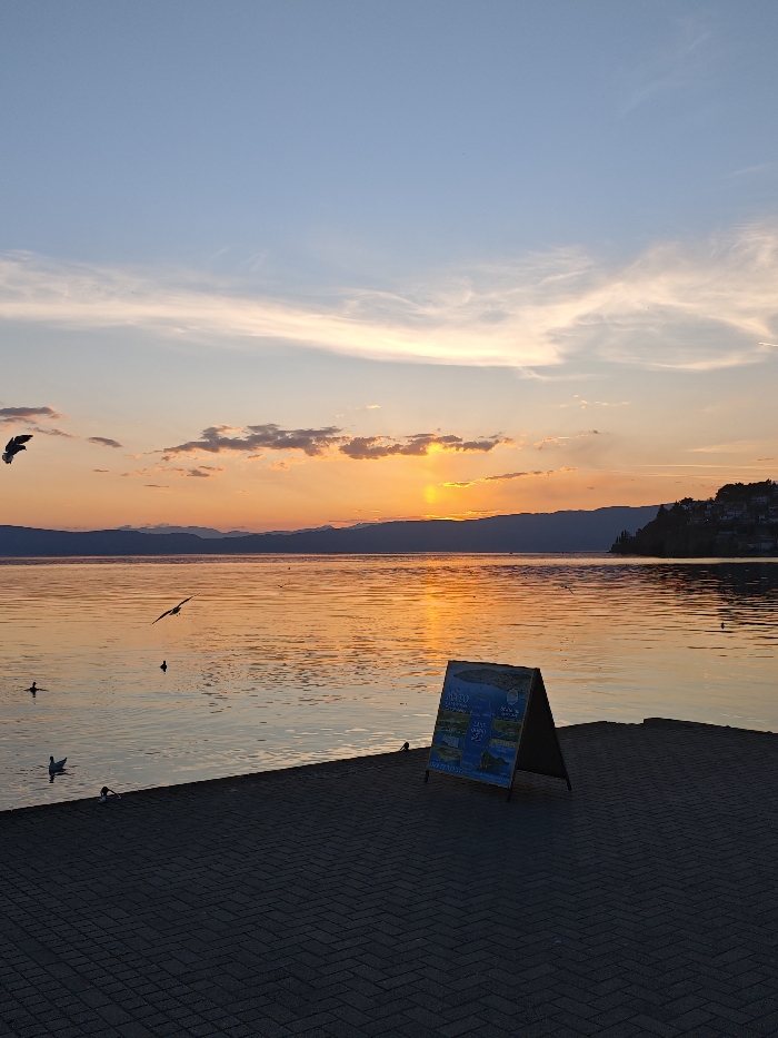 The image depicts a sunset over Lake Ohrid, viewed from a paved promenade in the city of Ohrid, North Macedonia