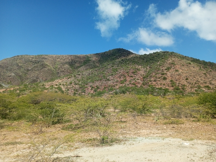 The image depicts a semi-arid, mountainous landscape under a clear blue sky with scattered white cumulus clouds. The scene is located in the vicinity of Juan Griego, Venezuela. The foreground consists of light brown, dry earth with sparse patches of light green, low-lying scrub brush and small, leafless or sparsely leaved trees. The midground transitions to more concentrated green foliage, forming thicker bushes and smaller trees, interspersed with dry, reddish-brown soil. The background is dominated by large, undulating hills and mountains. These elevations exhibit a mosaic of exposed reddish-brown rock formations and patches of darker green, denser vegetation that follows the contours of the terrain. No human subjects, man-made objects, or specific actions or interactions are visible within the frame.