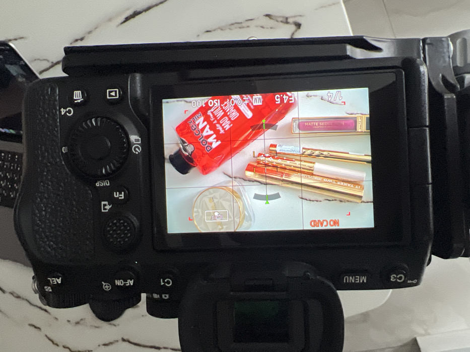A black Sony Alpha series digital mirrorless camera is depicted from a top-down view, positioned on a light-colored, marble-patterned surface. The camera's rear LCD screen displays a live view or captured image of various cosmetic products arranged in a flat lay. On the camera screen, a circular gold-rimmed compact powder container is visible in the upper left. To its right, a bright red, triangular bottle labeled "DOLCE MAN Amber & Fresh MAD WILD ORANGE 100 ml EDP" is prominently displayed. Below these, multiple slender, gold-toned tubes, resembling lipsticks or mascaras (one labeled "IT TAKE TWO"), are clustered. A rectangular, clear-cased dark pink lip product, labeled "MATTE SEOUL", is positioned in the lower right of the screen's view. The camera's screen overlays indicate "NO CARD" in the bottom left, alongside exposure settings of "F4.5", "1/4" shutter speed, and "ISO 100". A compositional grid and green focus brackets are also visible. Portions of the camera's top controls, including dials and buttons (AEL, AF-ON, Fn, Disp, C1, C3, C4, Menu), are visible around the screen. A dark, out-of-focus object, possibly a keyboard, is partially visible in the upper right background. This scene is located in Podolsk, Russia.