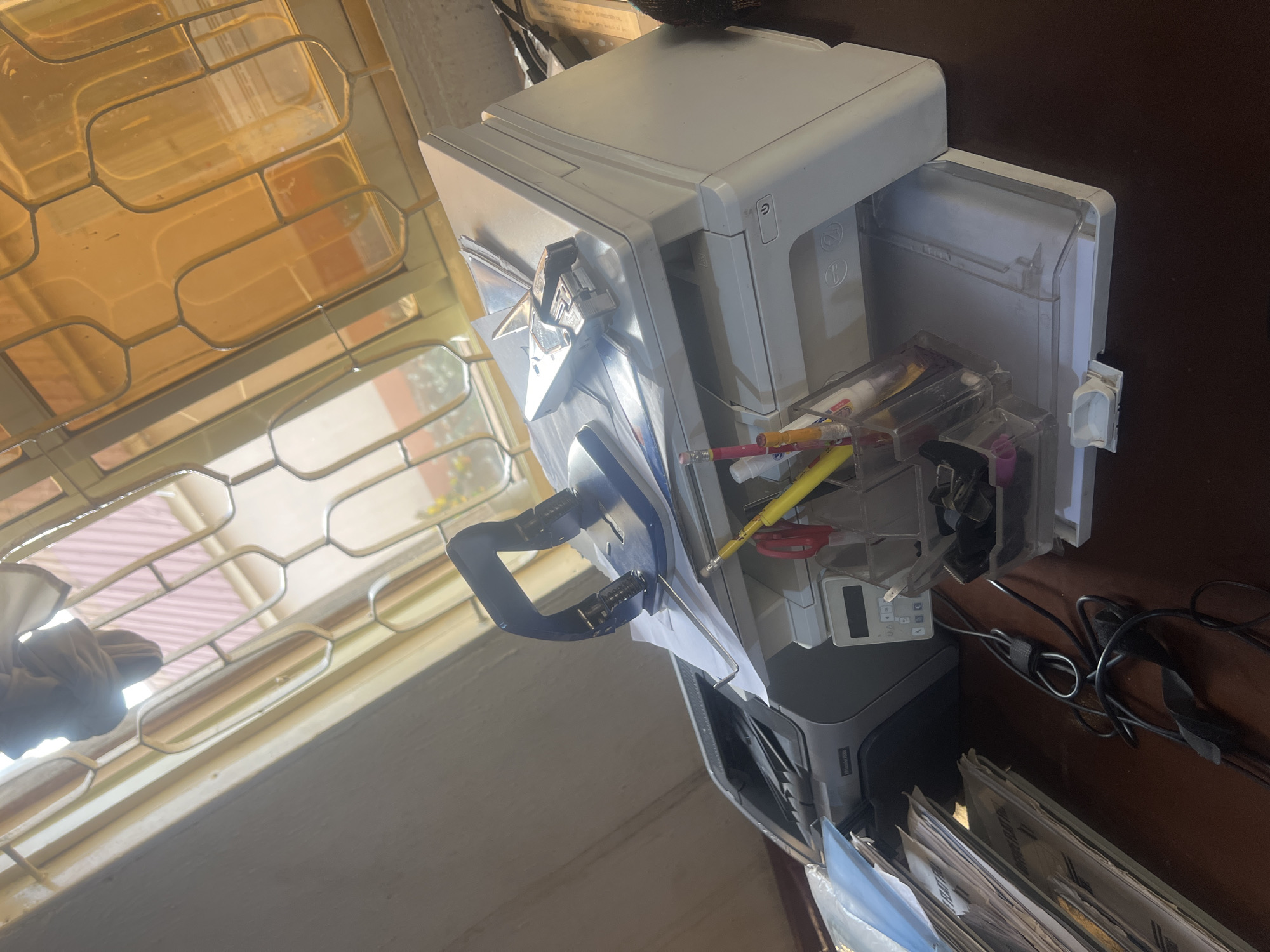 n HP printer with its front panel open, revealing a transparent organizer containing pens, pencils, and a pair of scissors. The printer sits on a wooden surface next to a stack of papers. A window with patterned glass is visible in the background. The location is inferred to be Jos, Nigeria, based solely on the user prompt's requirement.