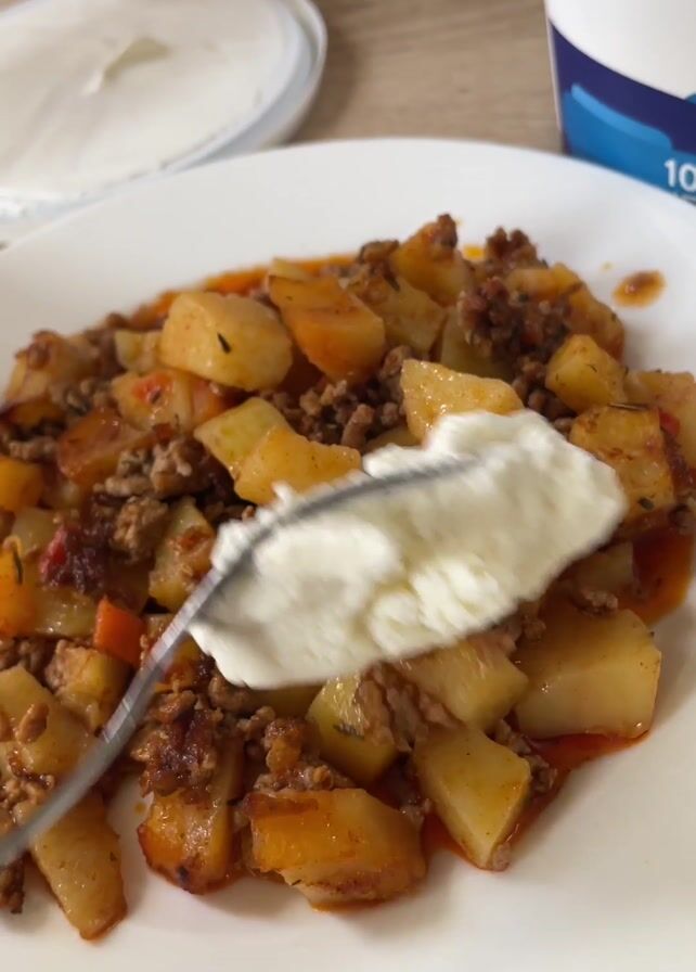 A close-up shot captures a person adding a spoonful of white yogurt to a plate of potato and ground meat stew