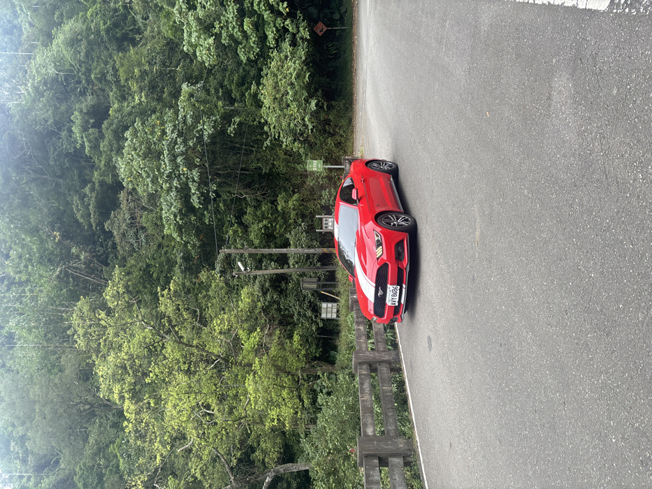 The image captures a red 2015-2017 Ford Mustang coupe, featuring twin white racing stripes along its hood and roof, stationary on an asphalt road in Meishan Township, Taiwan. The vehicle displays a front license plate reading "AVY-8686". To the left of the road, a concrete barrier with three horizontal rails runs parallel. The background consists of a dense, steep mountainside entirely covered in various shades of green trees and lush foliage, indicating a heavily forested, subtropical environment. Utility poles with power lines and a mounted surveillance camera are visible on the right side of the road, alongside several informational signs, one of which is green with white text. No individuals or other vehicles are present in the scene.