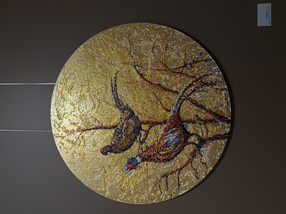- "A circular, highly textured oil painting depicting two pheasants on bare branches against a golden, textured background is centrally displayed on a plain brown wall" by FM-pez9w2, licensed under CC BY 4.0