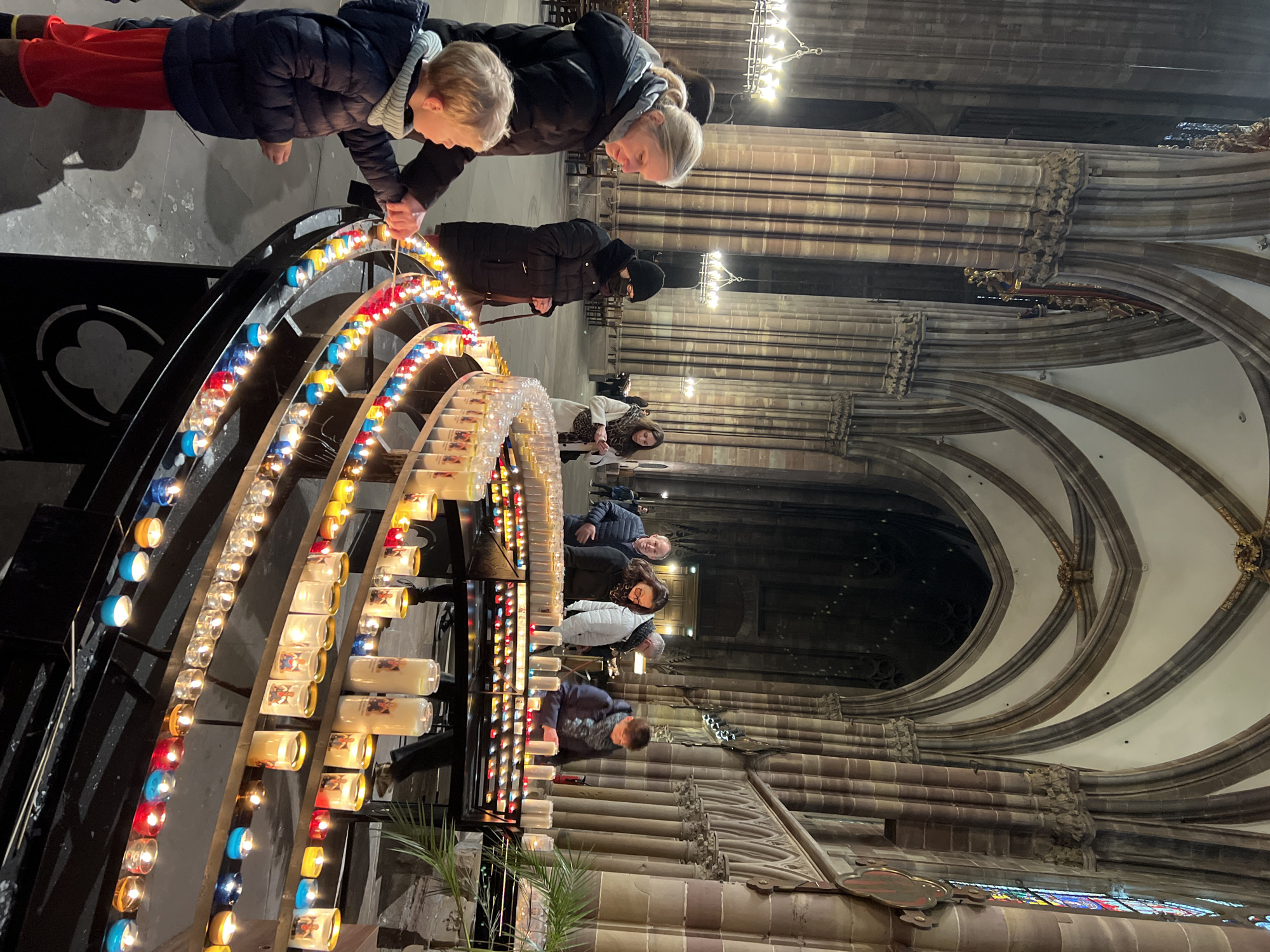 Inside Strasbourg Cathedral in Strasbourg, France, a boy and a woman are lighting candles in a large, semi-circular candle rack