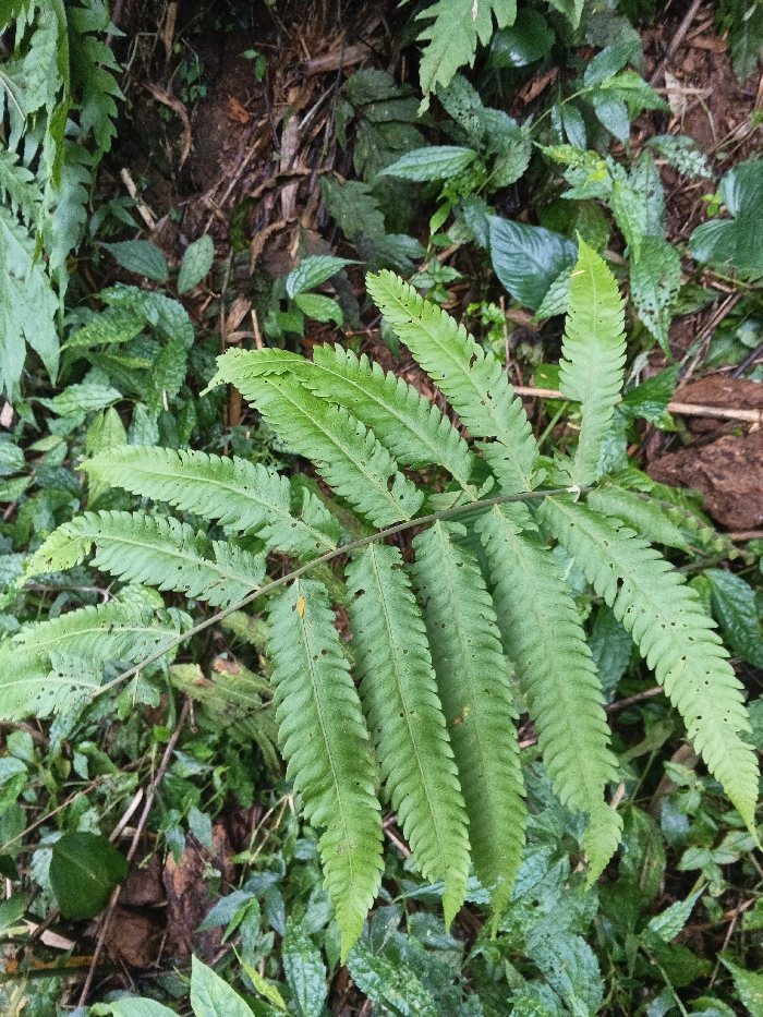 The image displays a close-up, top-down view of dense tropical undergrowth in Situm, Papua New Guinea. A large, vibrant green fern frond, characterized by numerous segmented pinnules, extends diagonally across the mid-ground from upper left to lower right. Several pinnules on the fern exhibit small, irregular perforations, consistent with insect activity. The surrounding environment consists of a layered mix of smaller green plants, dark brown soil, and scattered organic debris including dried leaves and thin branches. No human figures, animals, or man-made objects are present in the scene.