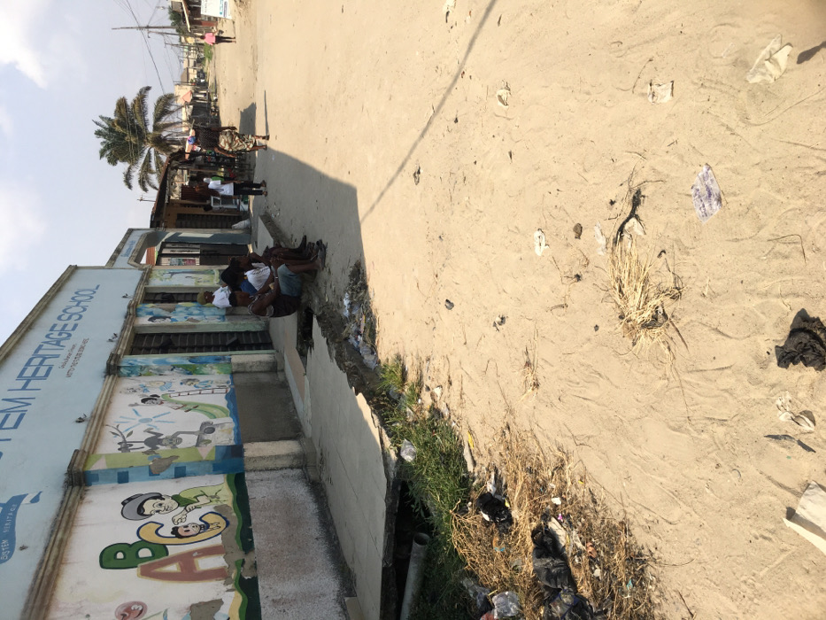 The image depicts an outdoor street scene in Badore, Nigeria, under bright daylight conditions. The foreground consists of an unpaved, light brown sandy surface sparsely covered with dried grass, plastic refuse, and dark organic debris. To the left, a damaged concrete sidewalk parallels the road, exposing an open drainage channel containing trash, green vegetation, and a white PVC pipe. A light blue building on the left, identified by the partial signage "STEM HERITAGE SCHOOL," features colorful murals on its lower facade. These murals illustrate cartoon-style figures, including children with letters 'A, B, C,' and scenes of activity. Multiple dark, rectangular window or door openings are visible. Four individuals, appearing to be adult males, are seated on the edge of the damaged sidewalk facing right. Their attire includes t-shirts and shorts. A fifth person in a white t-shirt is partially visible near a building entrance further left. The unpaved sandy road, extending into the midground and background, displays tire tracks, footprints, and scattered refuse similar to the foreground. A long, diagonal shadow crosses the road from the lower right. On the road, a female individual walks away from the viewer, carrying an object on her head and wearing a patterned skirt with a dark top. Two additional figures are visible further down the road: one in a white top and another in pink clothing on the far right. The background features low-rise buildings and structures, utility poles with overhead wires, and a prominent palm tree on the right. The sky is light blue with minimal cloud cover, indicative of clear weather.