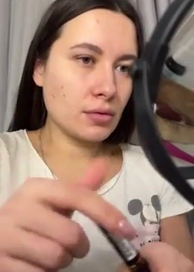 A young woman with long dark hair is applying black mascara while looking into a small round vanity mirror