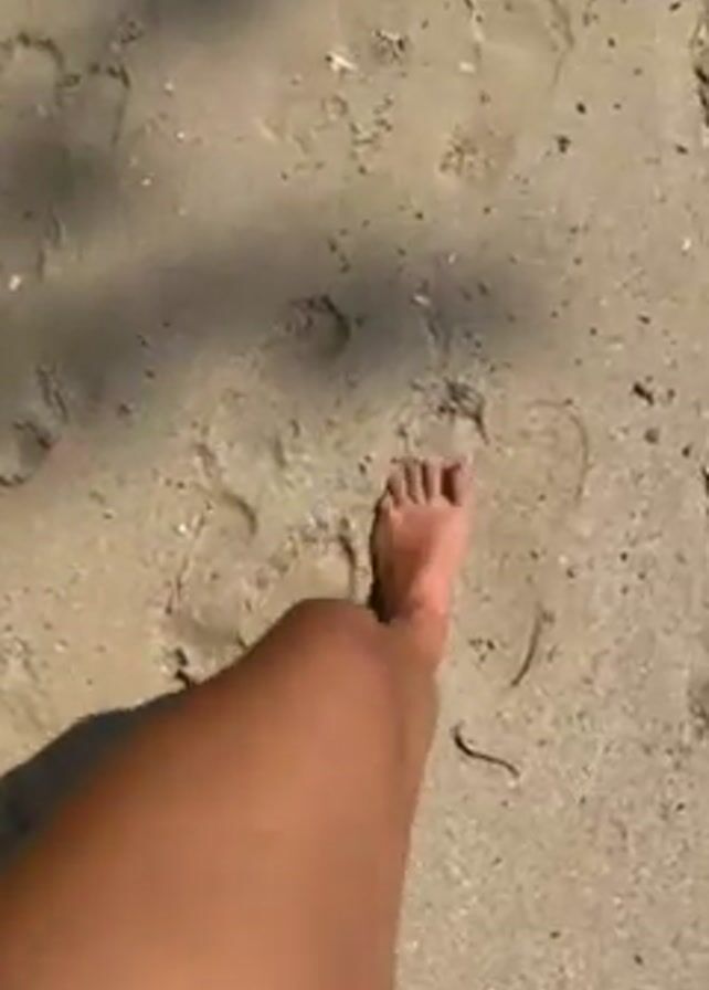 A person's bare foot and lower leg are visible in the lower right corner of the frame as they walk on a sandy beach