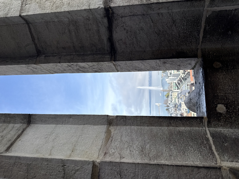 - "The image displays an elevated view of the city of Geneva, Switzerland, framed by a narrow, vertical opening in a substantial grey stone structure" by FM-z8OuP2, licensed under CC BY 4.0